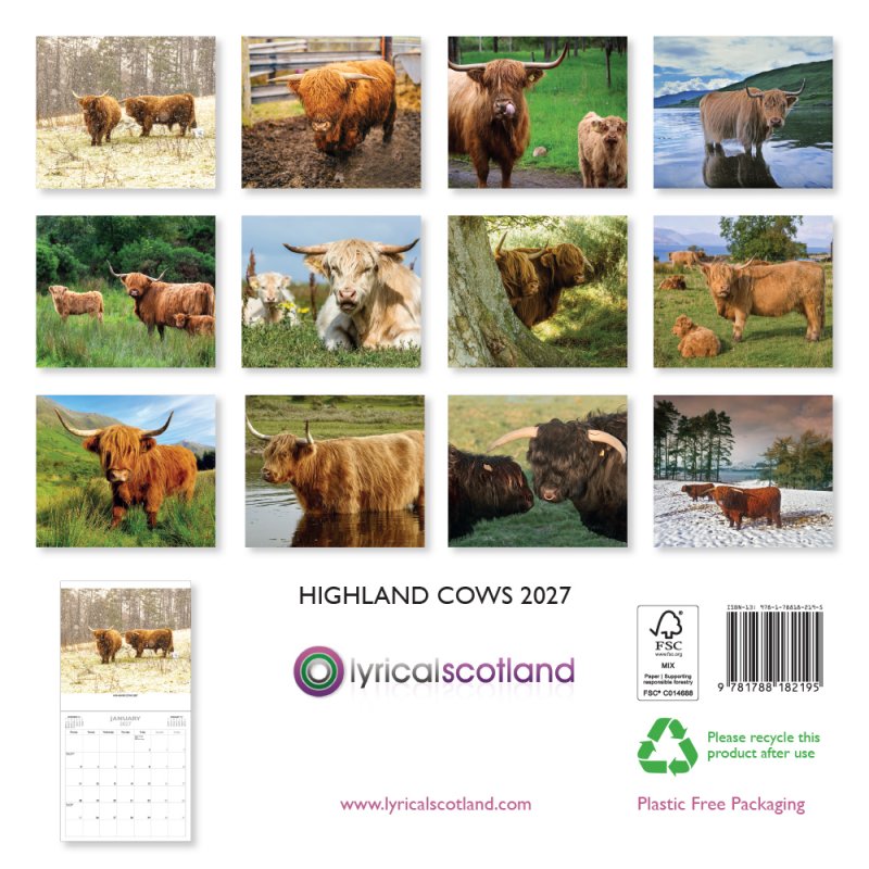 Our Lyrical Scotland range are 24 page wall calendars, offering a full page for the image and a full page for date boxes below. This range are supplied in plastic free envelopes suitable for posting, which can be opened to enclose a card or message and then resealed before sending. Calendar dimensions are 24cm x 24cm (48cm x 24cm when opened). |