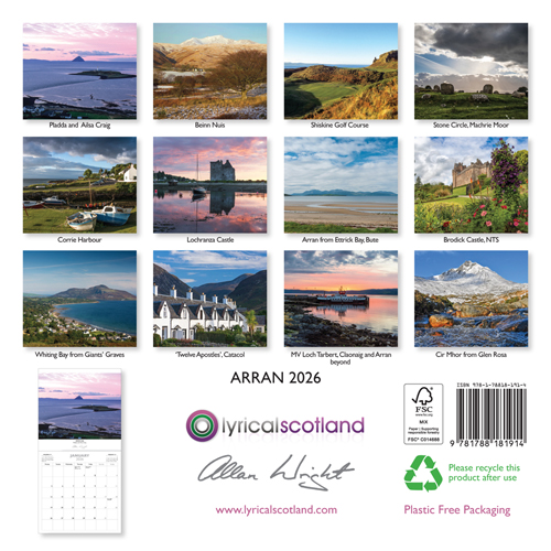 Featuring spectacular photography by Allan Wright, our range of 2026 calendars lets you bring Scotland in all its beauty into your home for the whole year. Our Lyrical Scotland range are 24 page wall calendars, offering a full page for the image and a full page for date boxes below. This range are supplied in plastic free envelopes suitable for posting, which can be opened to enclose a card or message and then resealed before sending. Our 2026 selection of images for Arran are: Pladda and Ailsa Craig; Beinn Nuis; Shiskine Golf Course; Stone Circle, Machrie Moor; Corrie Harbour; Lochranza Castle; Arran from Ettrick Bay, Bute; Brodick Castle, NTS; Whiting Bay from Giant's Graves; 'Twelve Apostles', Catacol; MV Loch Tarbert, Claonaig and Arran beyond; Cir Mhor from Glen Rosa. Calendar dimensions are 24cm x 24cm (48cm x 24cm when opened).