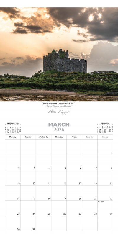 Featuring spectacular photography by Allan Wright, our range of 2026 calendars lets you bring Scotland in all its beauty into your home for the whole year. Our Lyrical Scotland range are 24 page wall calendars, offering a full page for the image and a full page for date boxes below. This range are supplied in plastic free envelopes suitable for posting, which can be opened to enclose a card or message and then resealed before sending. Our 2026 selection of images for Fort William and Lochaber are: Glenfinnan Monument, NTS; Caledonian Canal, Loch Lochy; Castle Tioram, Loch Moidart; Glencoe Lochan; Glen Etive, Loch Etive; the Jacobite, Glenfinnan Viaduct; Small Isles from Arisaig; Mallaig; Glen Nevis; Inverlochy Castle; Polnish, Lochailort; Buachaille Etive Mor. Calendar dimensions are 24cm x 24cm (48cm x 24cm when opened).