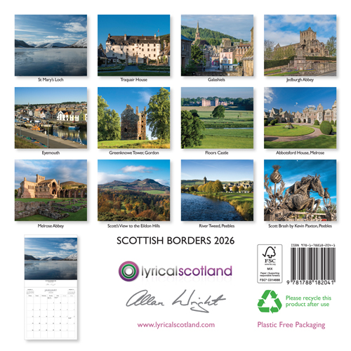 Featuring spectacular photography by Allan Wright, our range of 2026 calendars lets you bring Scotland in all its beauty into your home for the whole year. Our Lyrical Scotland range are 24 page wall calendars, offering a full page for the image and a full page for date boxes below. This range are supplied in plastic free envelopes suitable for posting, which can be opened to enclose a card or message and then resealed before sending. Our 2026 selection of images for the Scottish Borders are: St Mary's Loch; Traquair House; Galashiels; Jedburgh Abbey; Eyemouth; Greenknowe Tower, Gordon; Floors Castle; Abbotsford House, Melrose; Melrose Abbey; Scott's View to the Eildon Hills; River Tweed, Peebles; Scott Brash, Peebles. Calendar dimensions are 24cm x 24cm (48cm x 24cm when opened). |